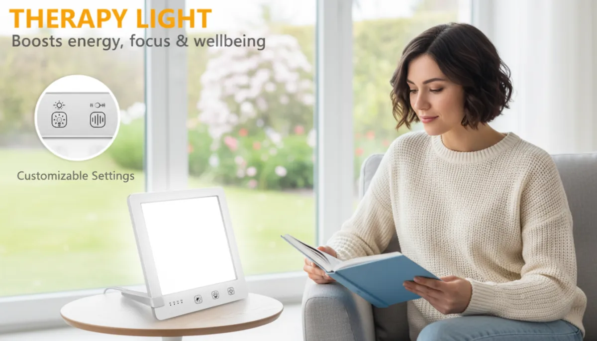 A portable, high-intensity light therapy device that simulates natural sunlight to combat the effects of Seasonal Affective Disorder (SAD), fatigue, and low mood.